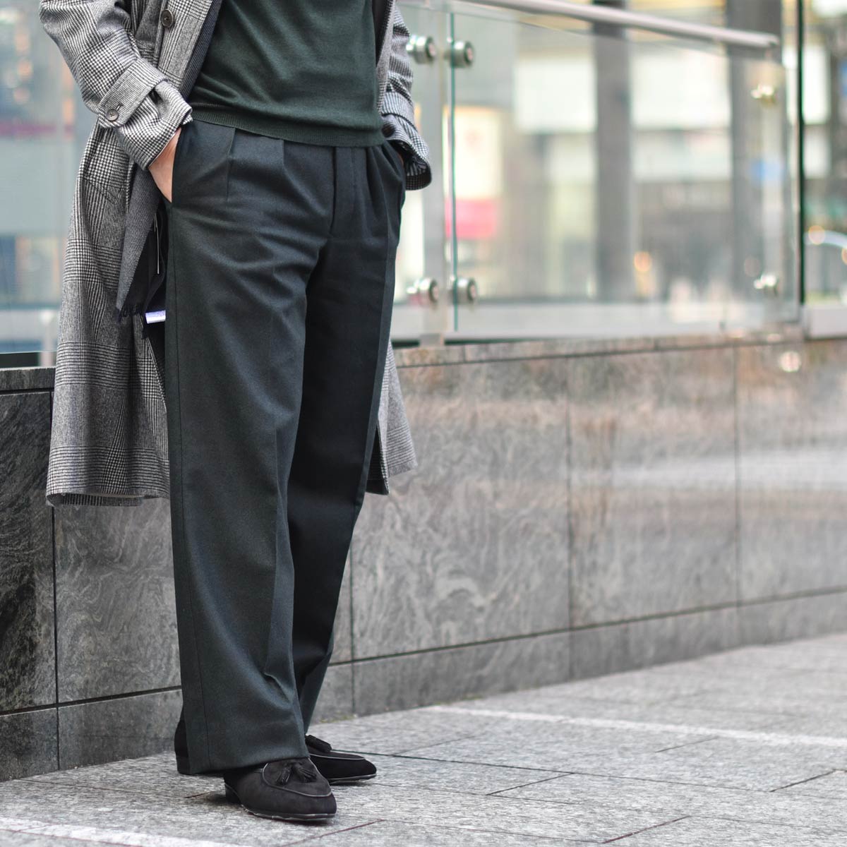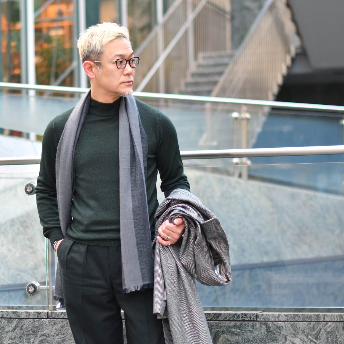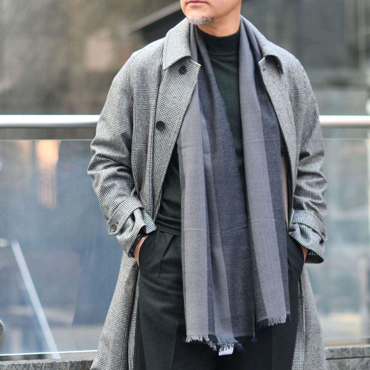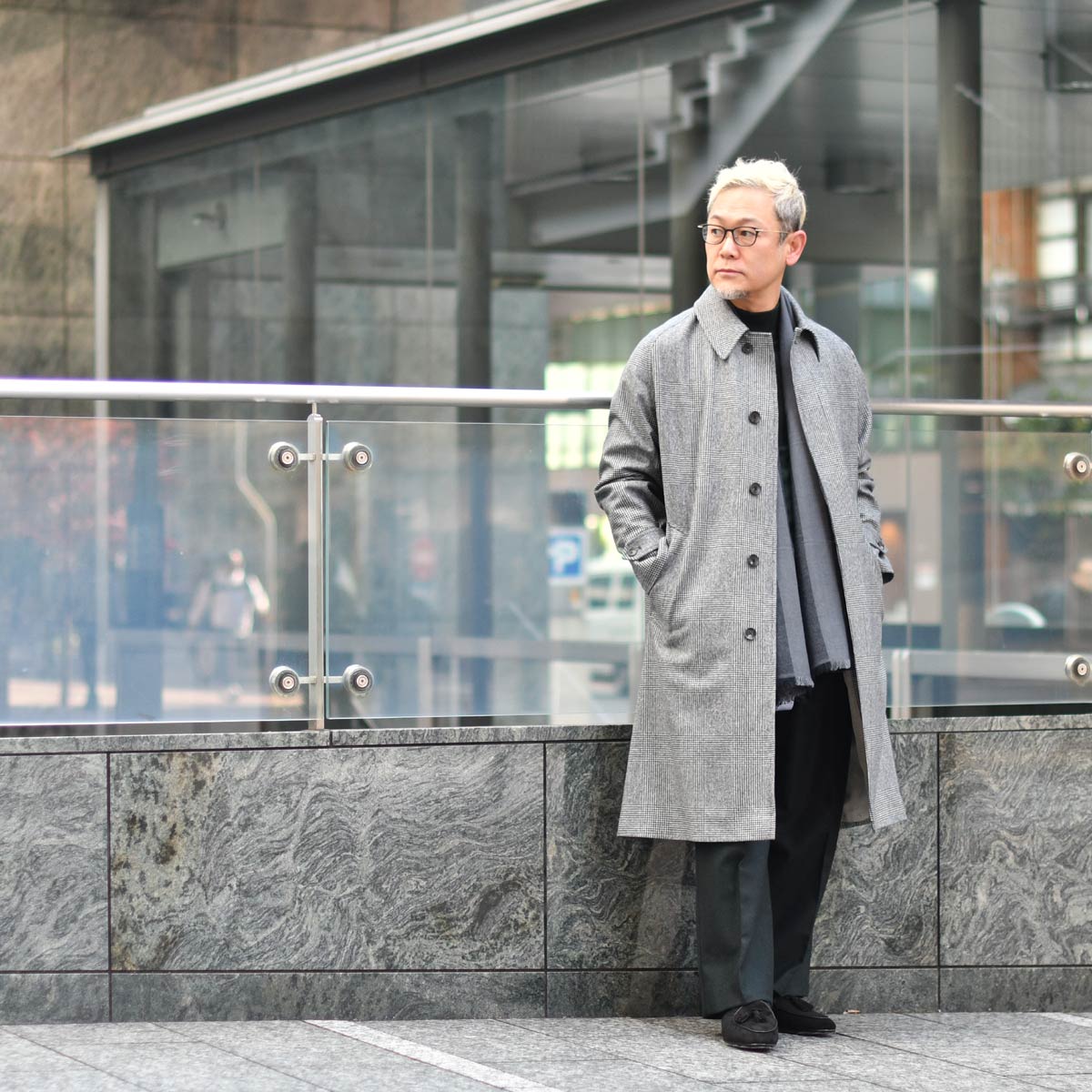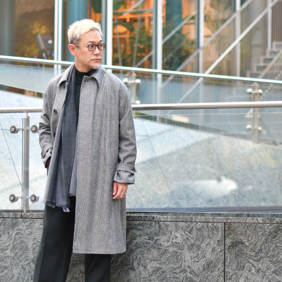 グレーのグレンチェック柄がブリティッシュ且つモダンなコートに、