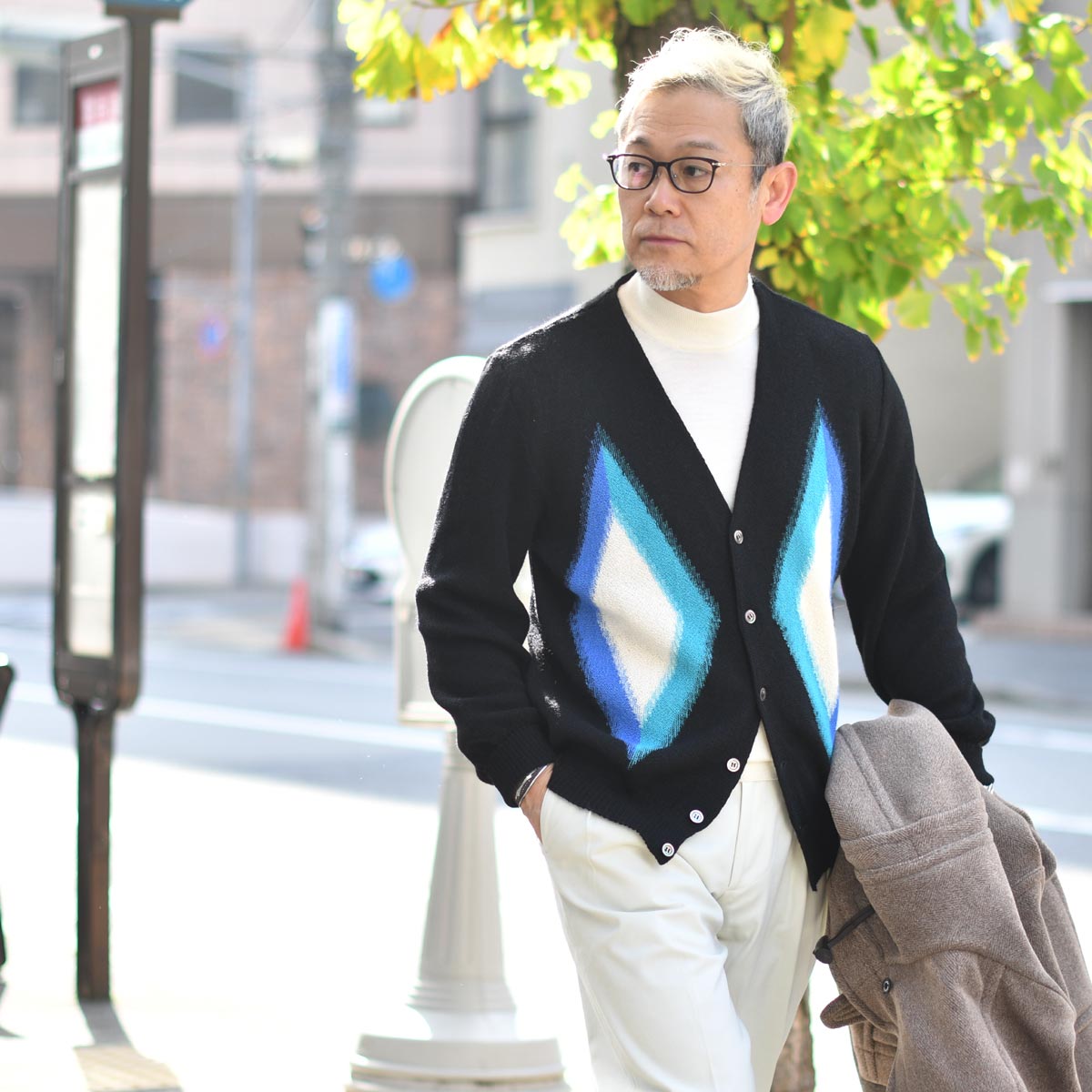 ダイヤ柄カーディガンを差し色にしてみてはいかがでしょう。是非ご参考にどうぞ!!