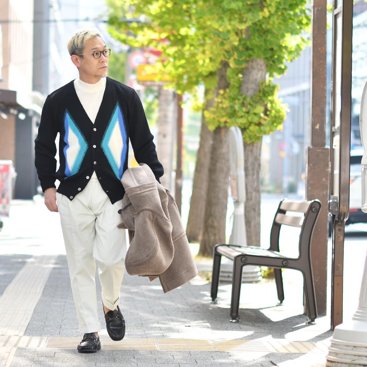 ダイヤ柄カーディガンを差し色にしてみてはいかがでしょう。是非ご参考にどうぞ!!