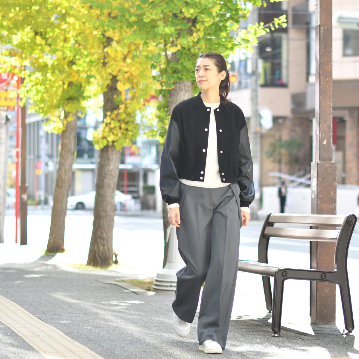 ボトムスには、あえて落ち感のあるワイドスラックスを選び、足元はストラップパンプスで抜け感を演出。