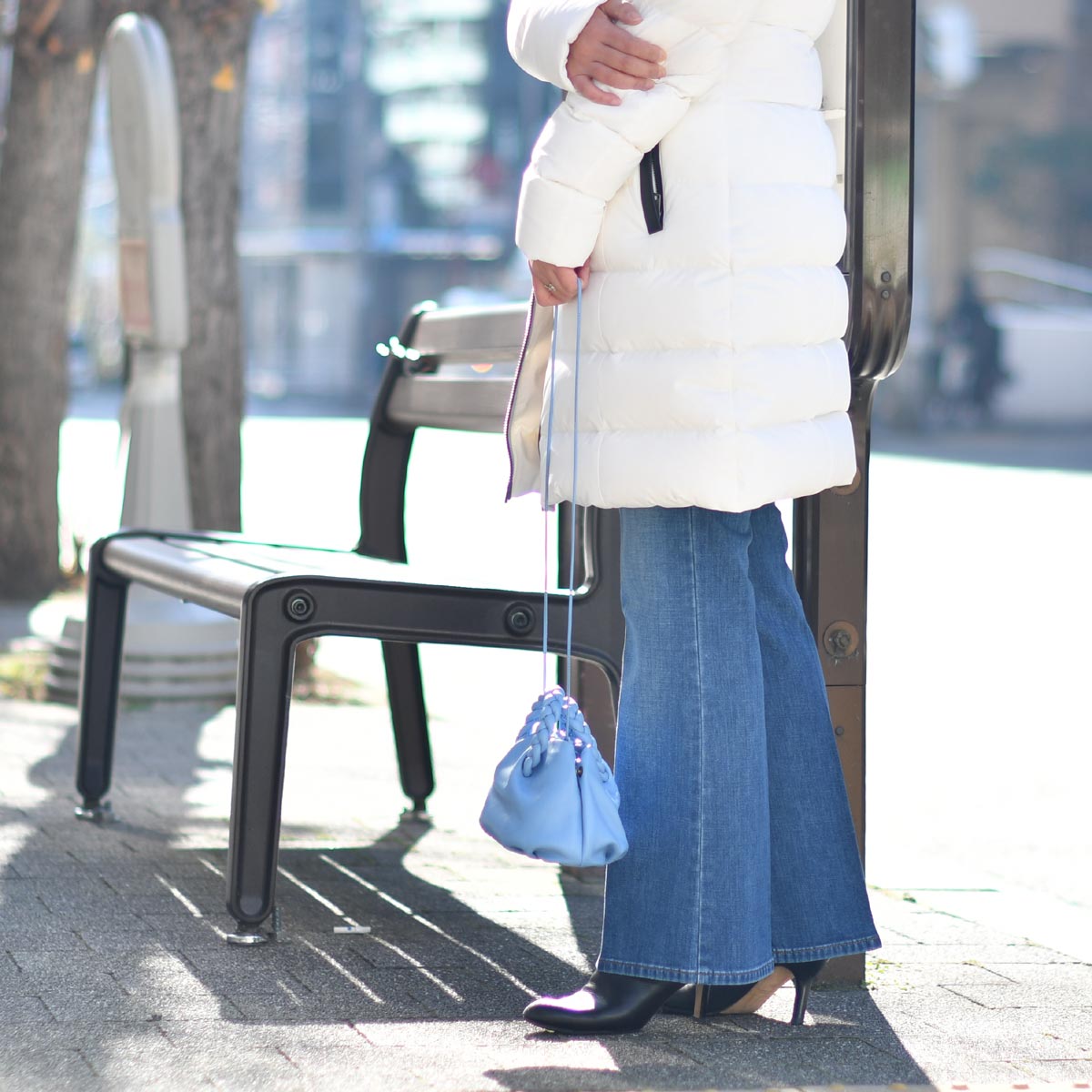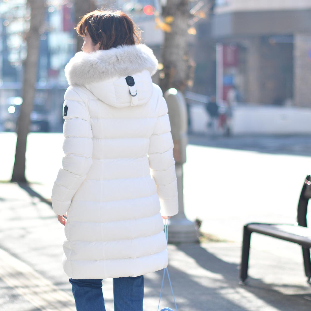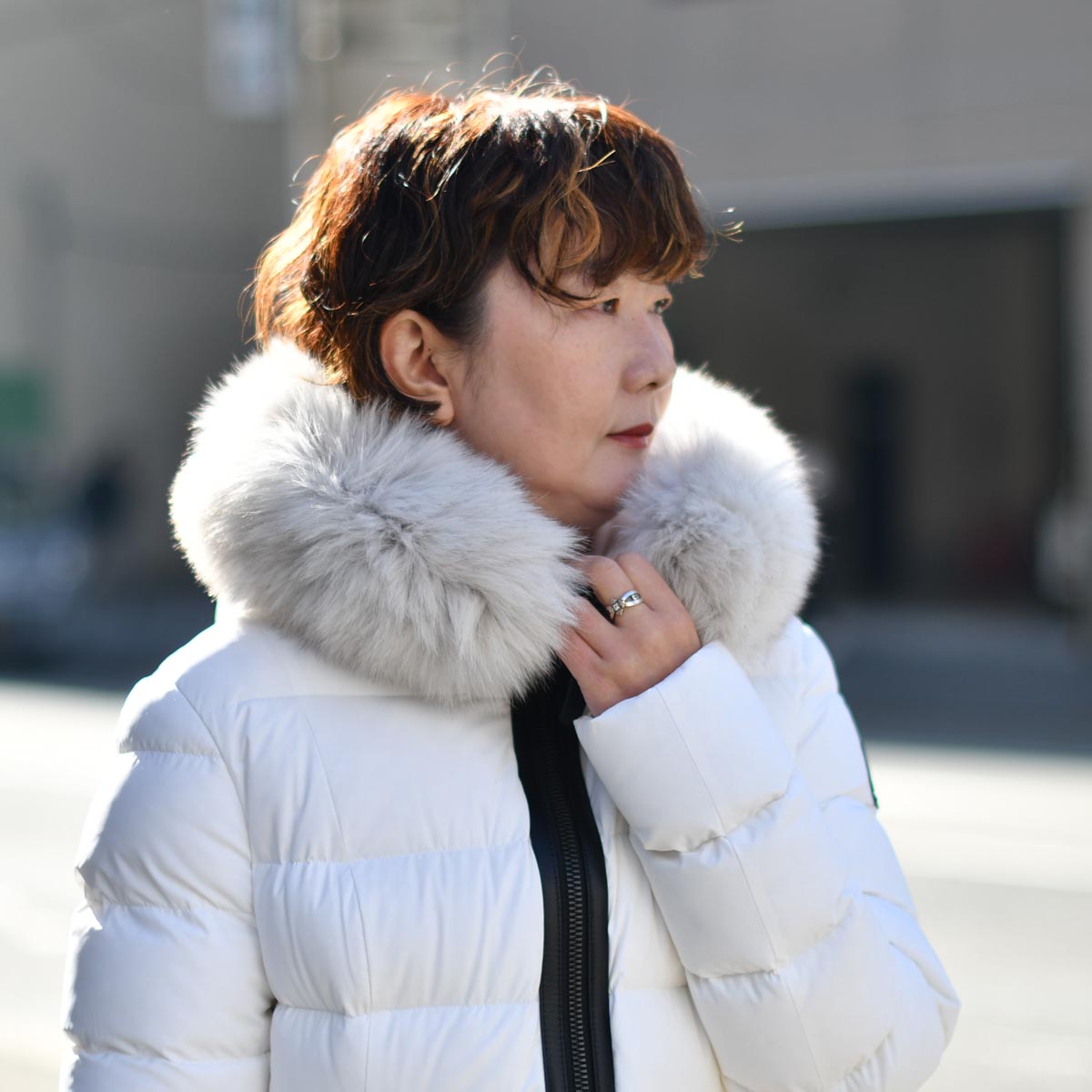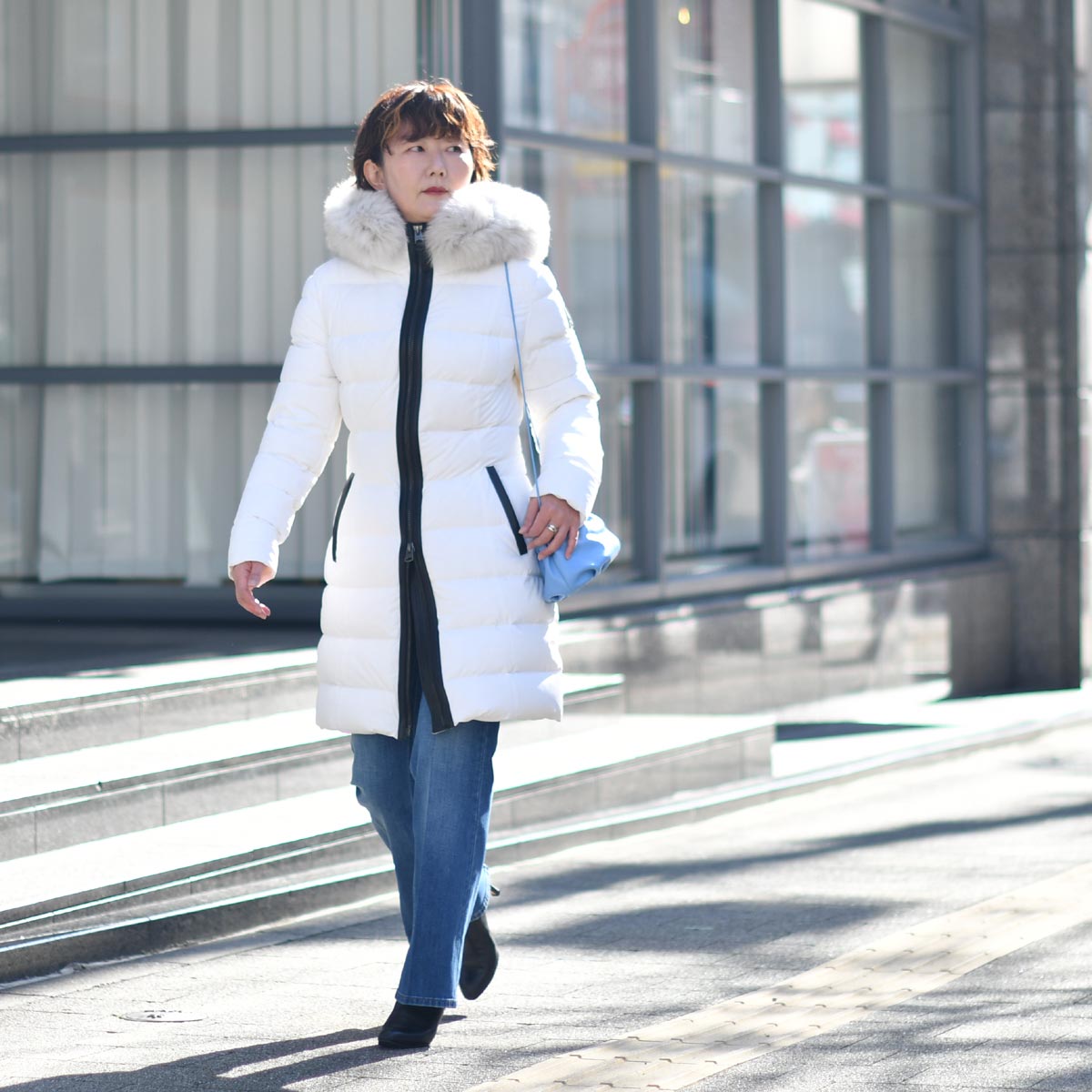 まっ白ダウンコートに、リアルレザーのブラックラインが効いた