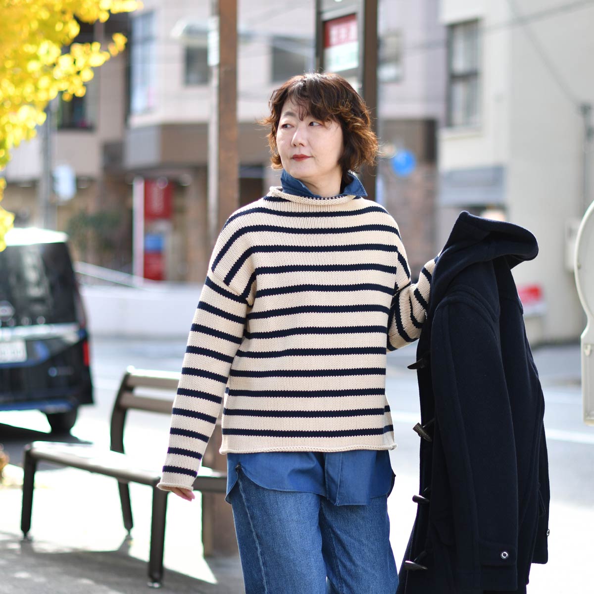 ボーダーニットに、ダンガリーシャツをレイヤード。