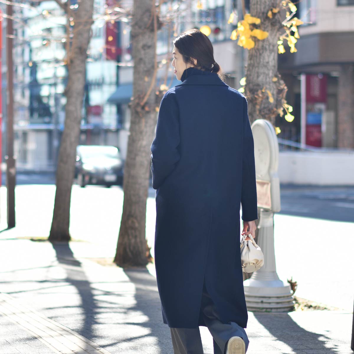 主役は、スーパー120’Sウールメルトンの上質なダブルフェイス素材を使用したネイビーのロングチェスターコート。