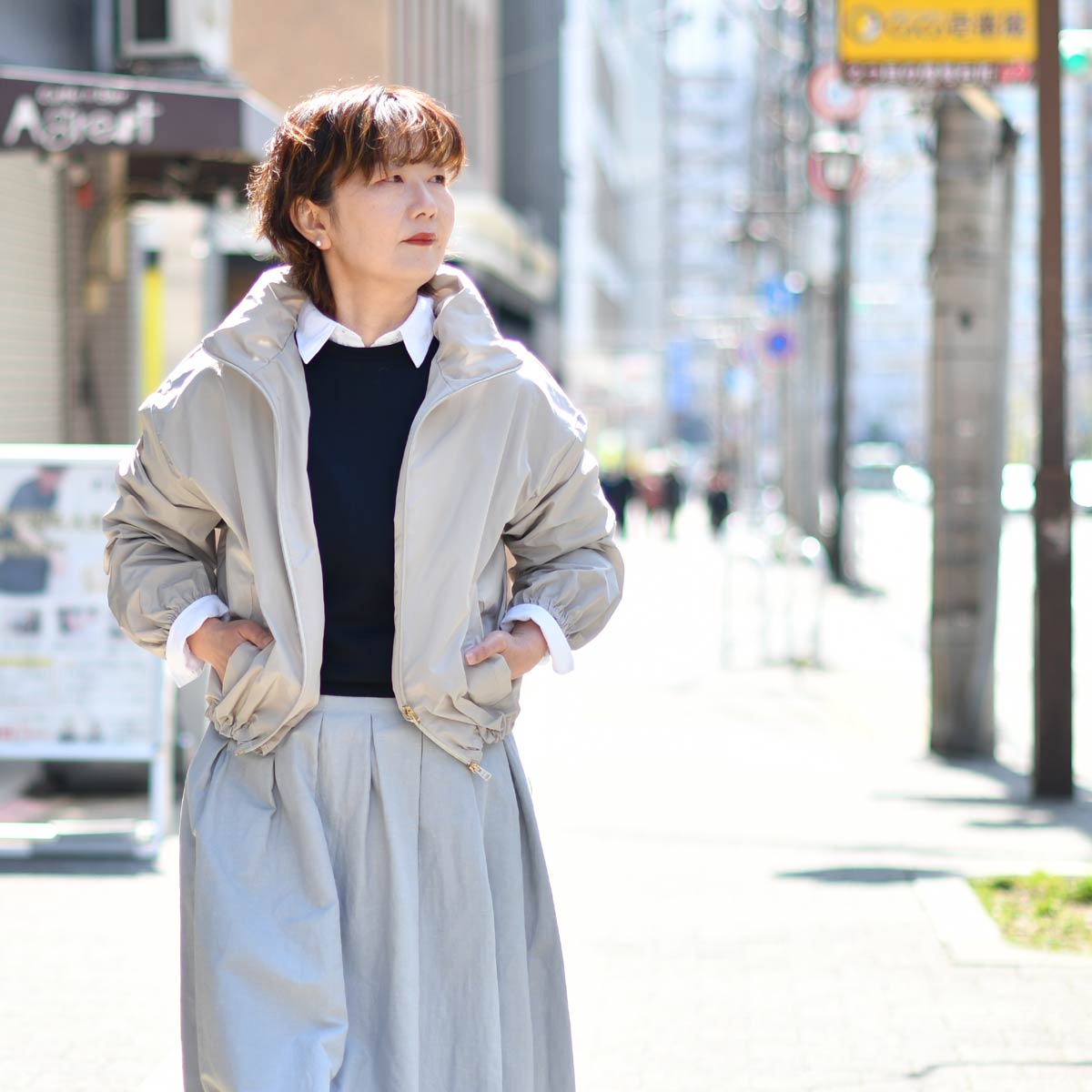 アウターにはHERNOのショートブルゾンを羽織り