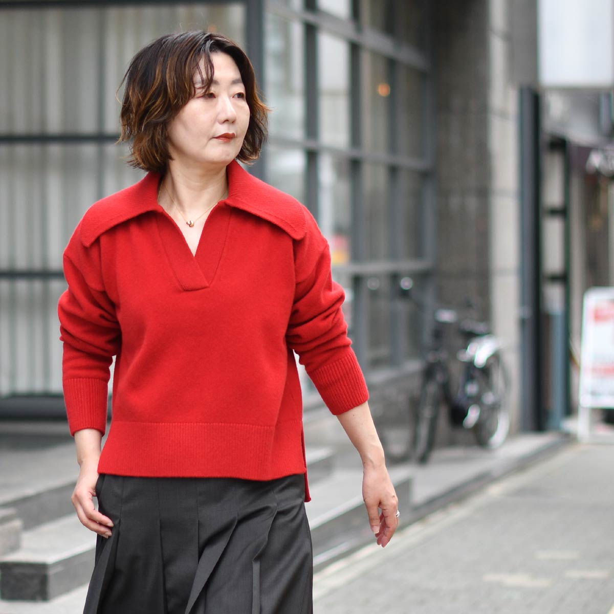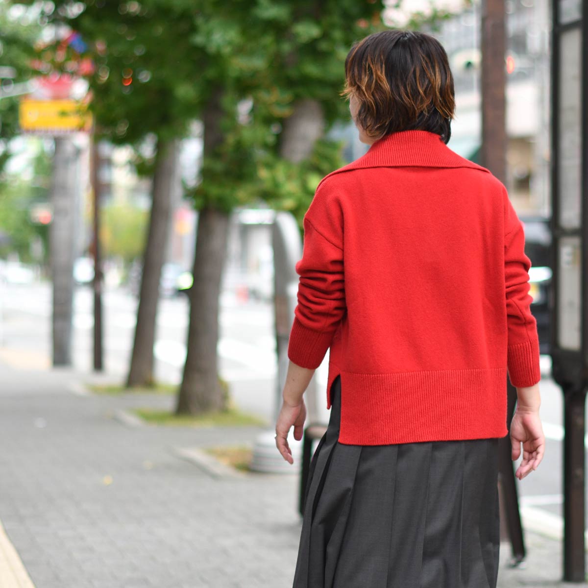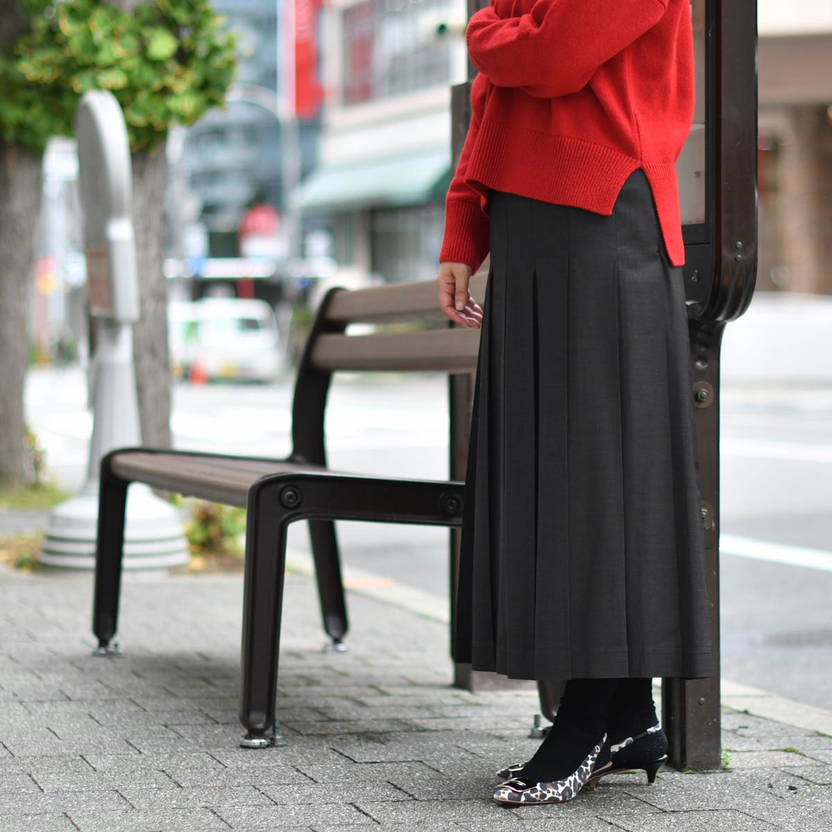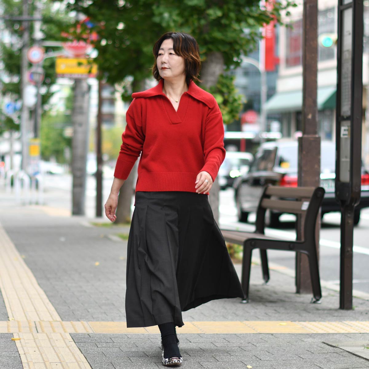 コクのある赤ニットにグレイッシュなブラウンスカート。