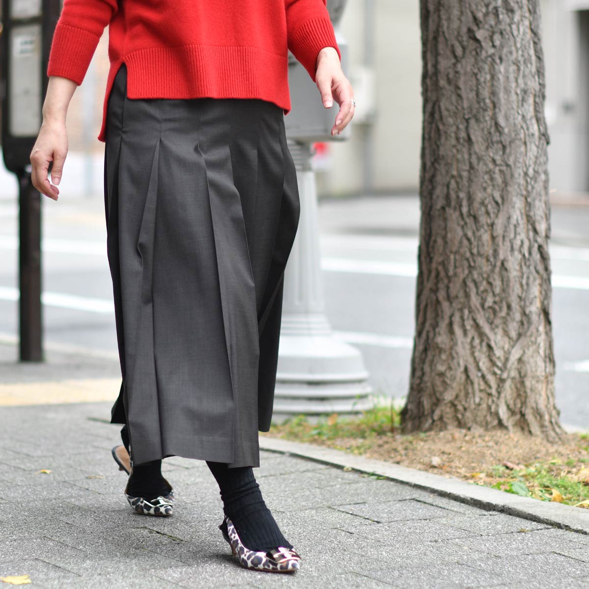 ふくらはぎが隠れるくらいの丈感は、ソックス合わせやブーツとの