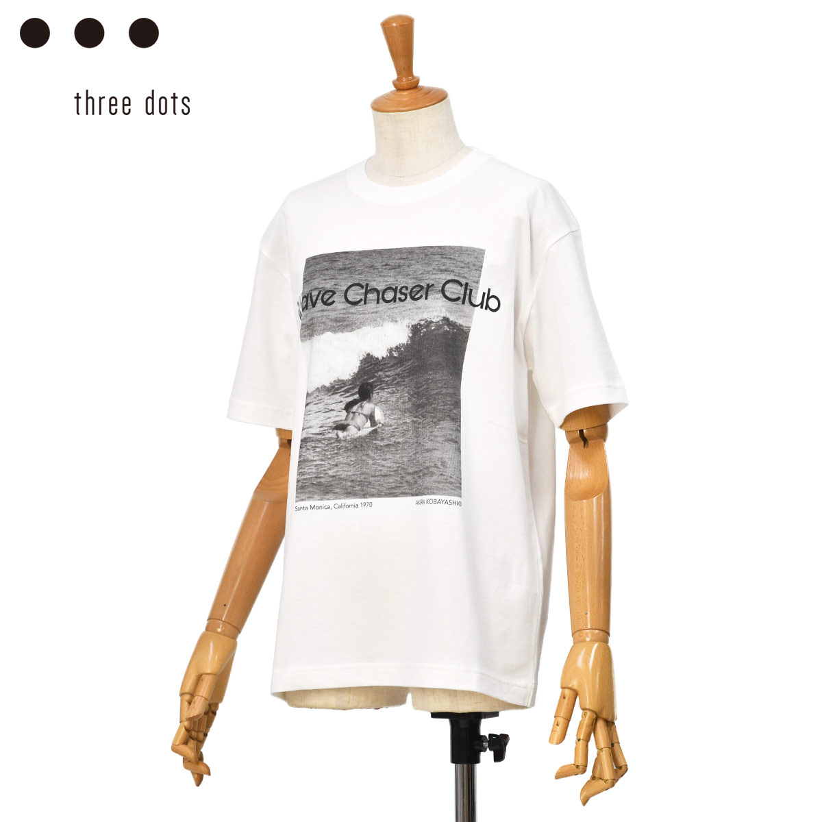 ◆three dots【スリードッツ】グラフィック半袖Tシャツ AK1005YU 038 WAVE CHASER コットン ホワイト