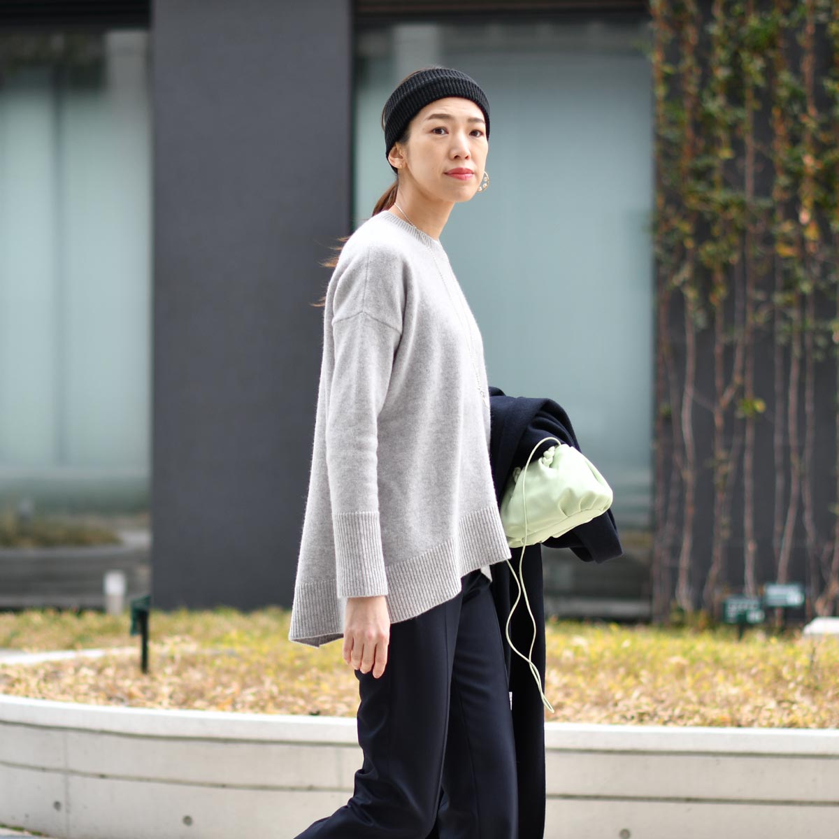 ヒップラインをカバーするゆったりした身幅に対し、袖まわりはすっきり絞ることで、