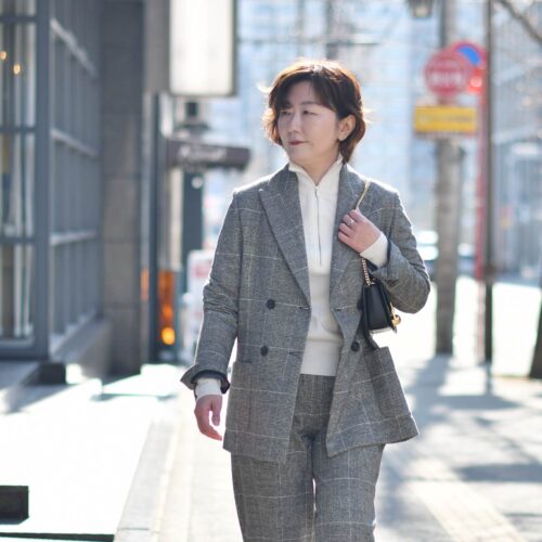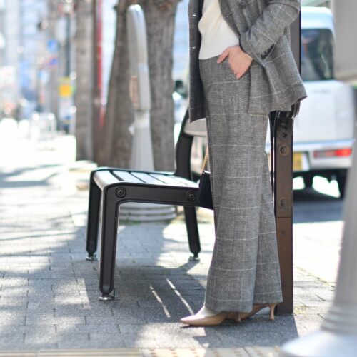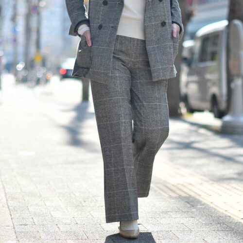 丈感のあるダブルのジャケットに、ボリュームのあるワイドパンツの組み合わせも