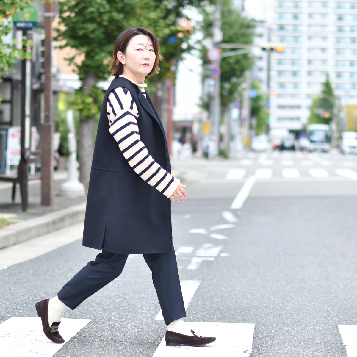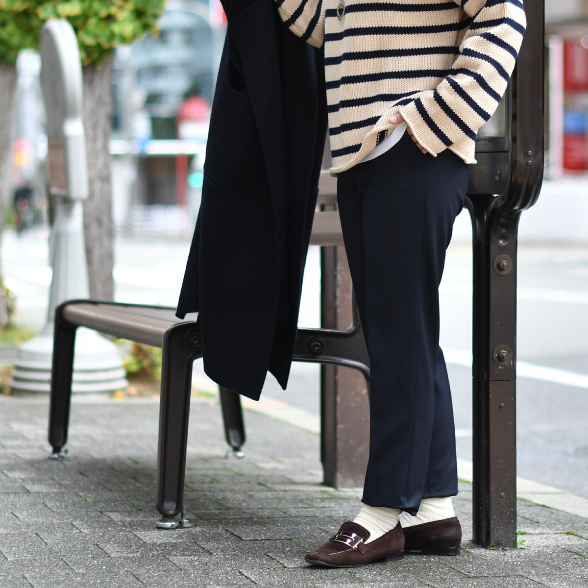 ボーダーニット×スッキリパンツのベーシックなスタイルも