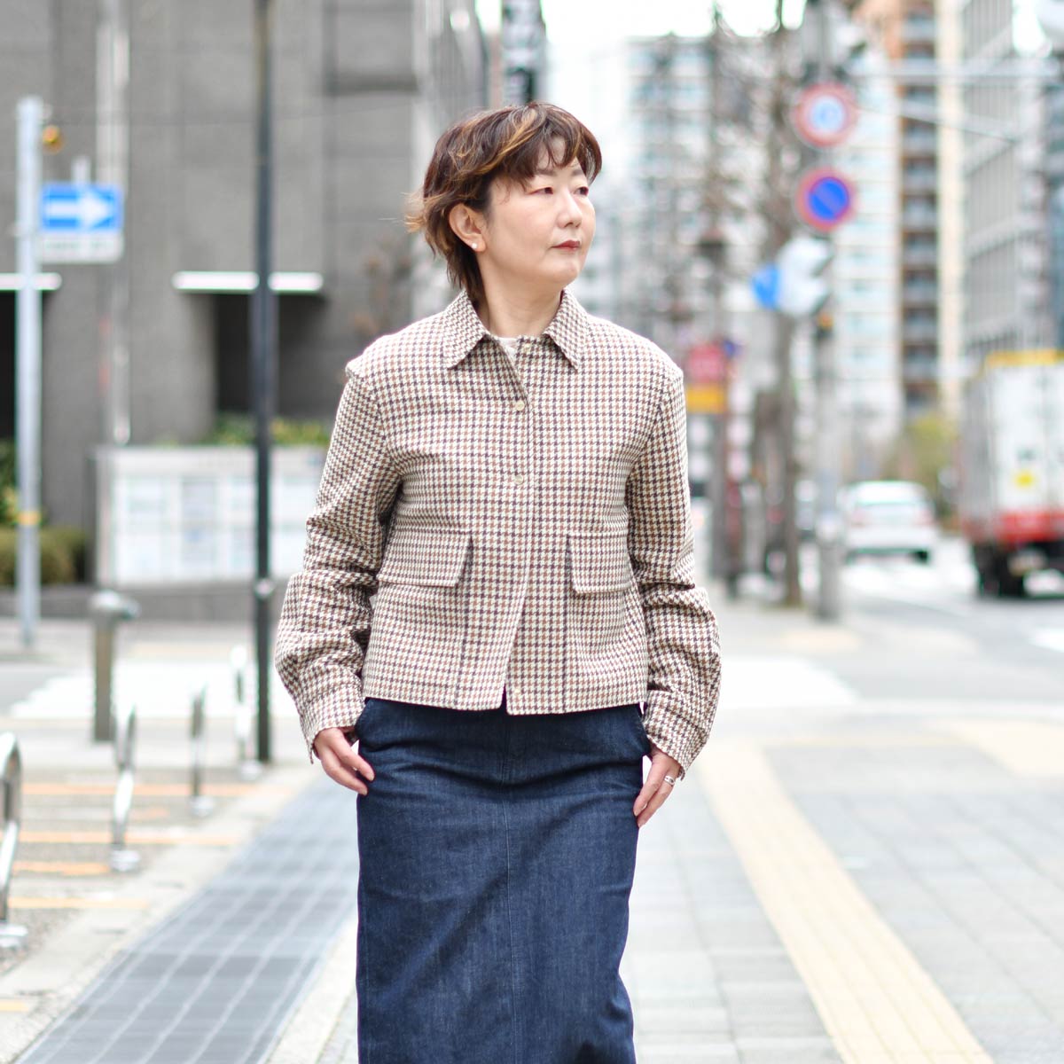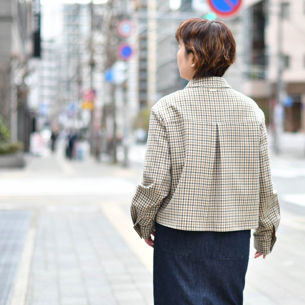 奥行きのある千鳥格子柄が目を引くシャツ型のブルゾン。